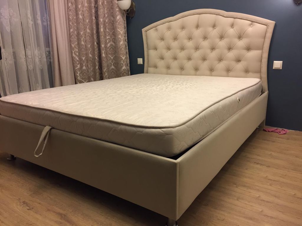 Конструкция кровати усилена металотраверсами, фурнитурой Via Ferrata, крепким дном бельевого ящика, съемным средником в металлических пазах и усиленным сквозным крепежом с пресс шайбой. Стразы и каретная стежка изголовья подчеркнут изысканность вашей спальни. Для завершенности дизайна, кровать можно доукомплектовать ножками из бука!