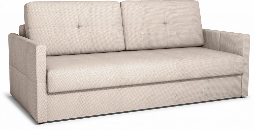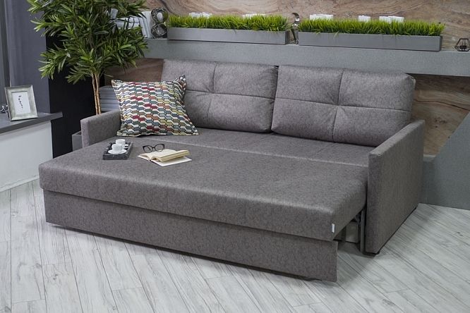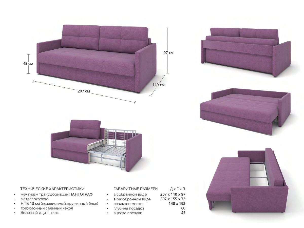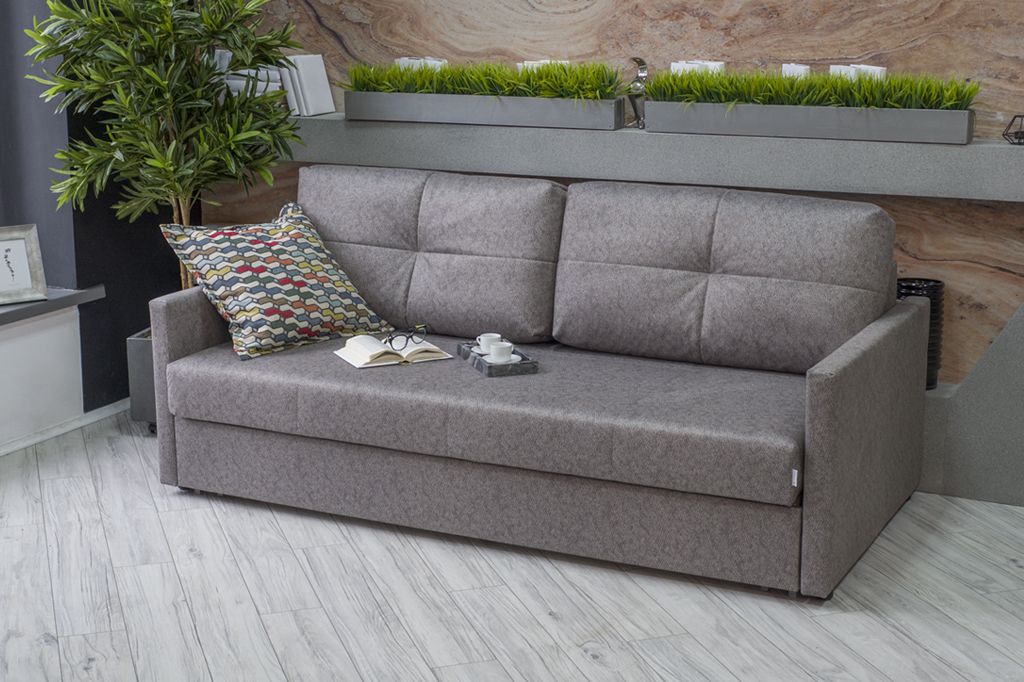 Самый компактный диван на механизме трансформации пантограф (усовершенствованная еврокнижка). Механизм раскладывания рассчитан на многолетнюю ежедневную эксплуатацию, он не сломается, имеет гарантию, не создает шума и проблем. Преимущества модели: полноценное спальное место, ящик, простой и универсальный дизайн, узкие подлокотники.