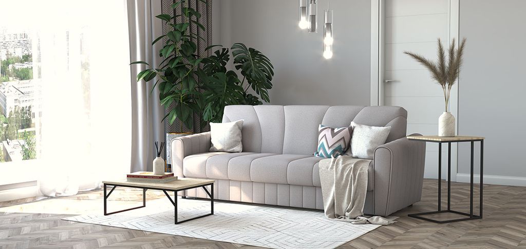 Легкая трансформация дивана в положение кровать с любой фронтальной точки сиденья. Не портит напольное покрытие.