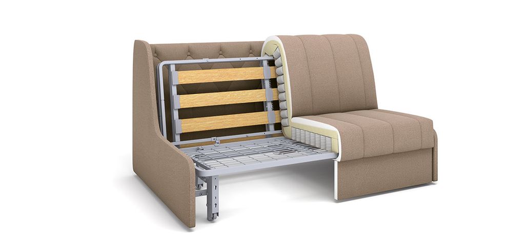 Идеально ровное спальное место за счет единого матраса в изголовье и средней секции и особой 3-секционной конструкции рамы: изголовье – место наименьшей нагрузки – стандартные латы 53 мм, секция максимальной нагрузки в положении кровать – широкие латы 83 мм с увеличенным порогом прочности, секция максимальной нагрузки в положении диван – металлическая сетка грид. Максимальное удобство и мягкость обеспечивает матрас Суперкомфорт с независимым пружинным блоком.