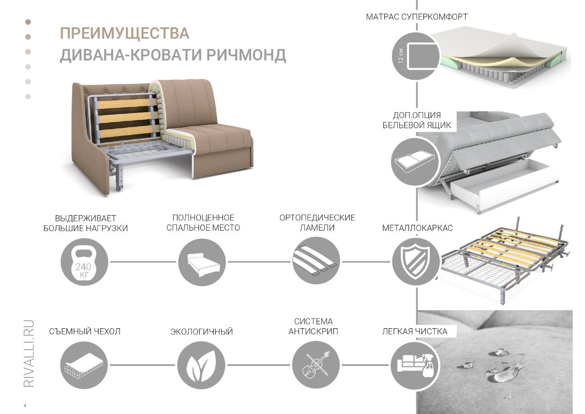 Диван-кровать Ричмонд на базе механизма трансформации аккордеон - стильный и уютный вариант для оформления современного и классического дизайна интерьера. За счет декоративных утяжек на высокой спинке диван в разложенном виде выглядит как элегантная кровать. Скругленные углы узких подлокотников делают его безопасным.