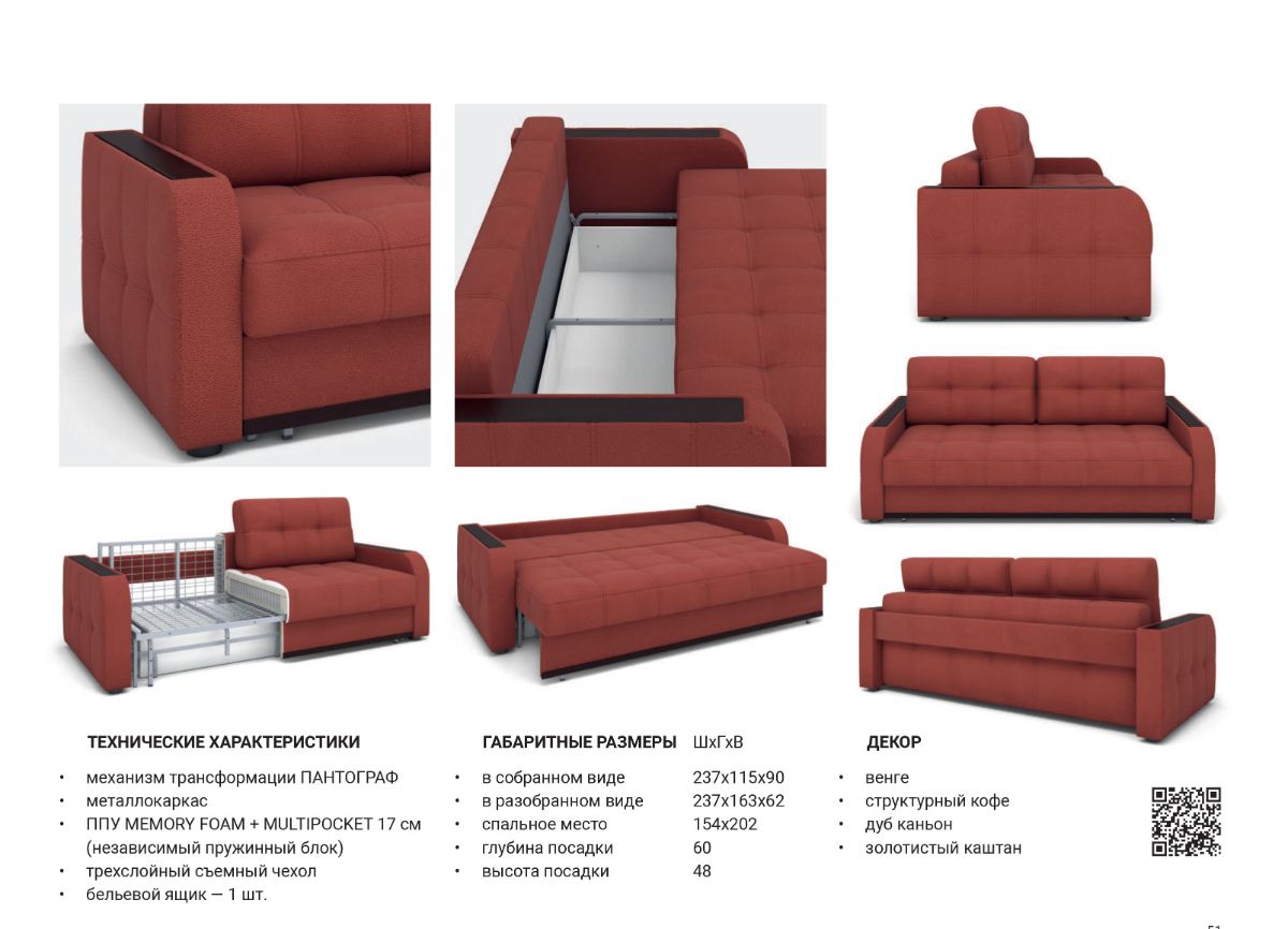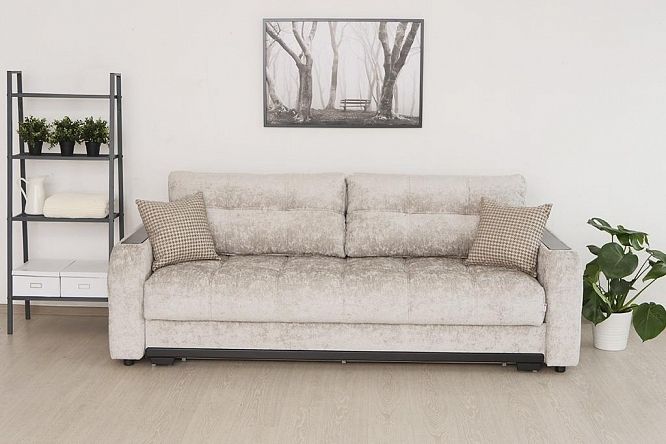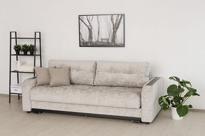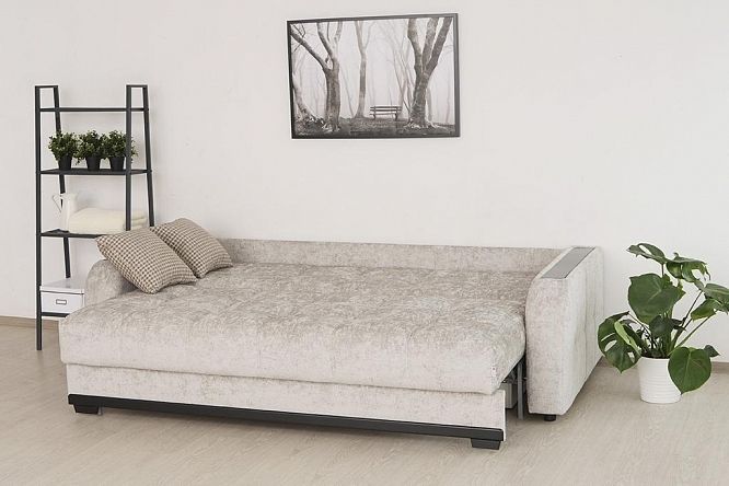 Модель выполнена на металлокаркасе и имеет повышенный срок эксплуатации по сравнению с деревянными аналогами. Диван оснащен одним из самых популярных механизмов трансформации - пантограф. "Шагающий" механизм удобен и прост в эксплуатации и позволяет без проблем раскладывать диван, не повреждая пол и не скатывая напольное покрытие. В полностью разложенном виде Монако превращается в двуспальную кровать.
