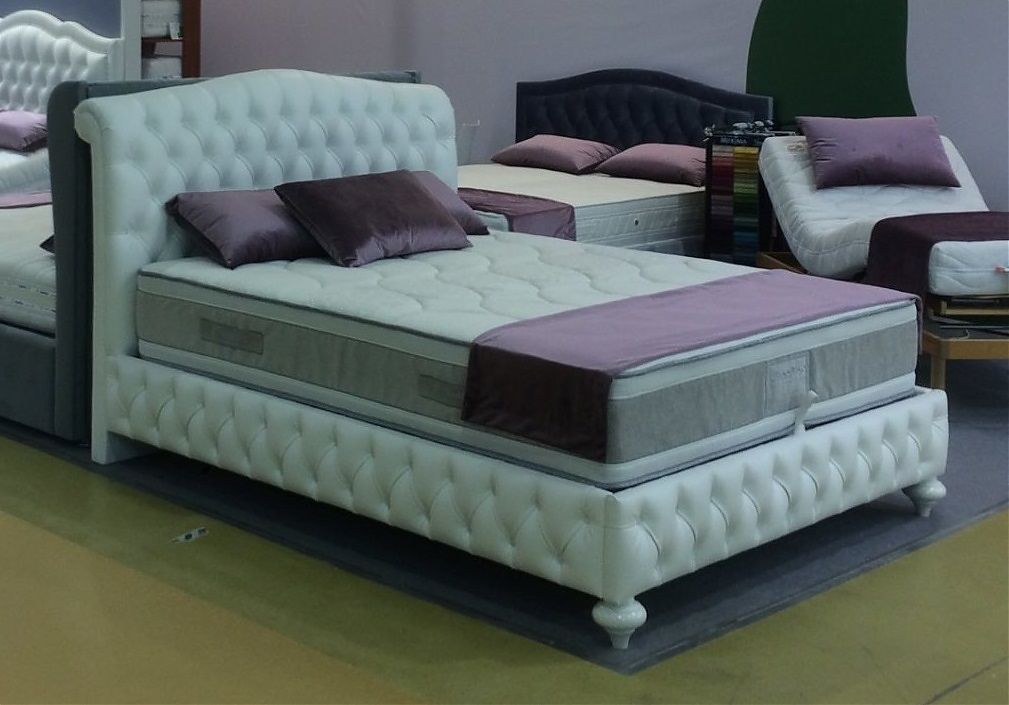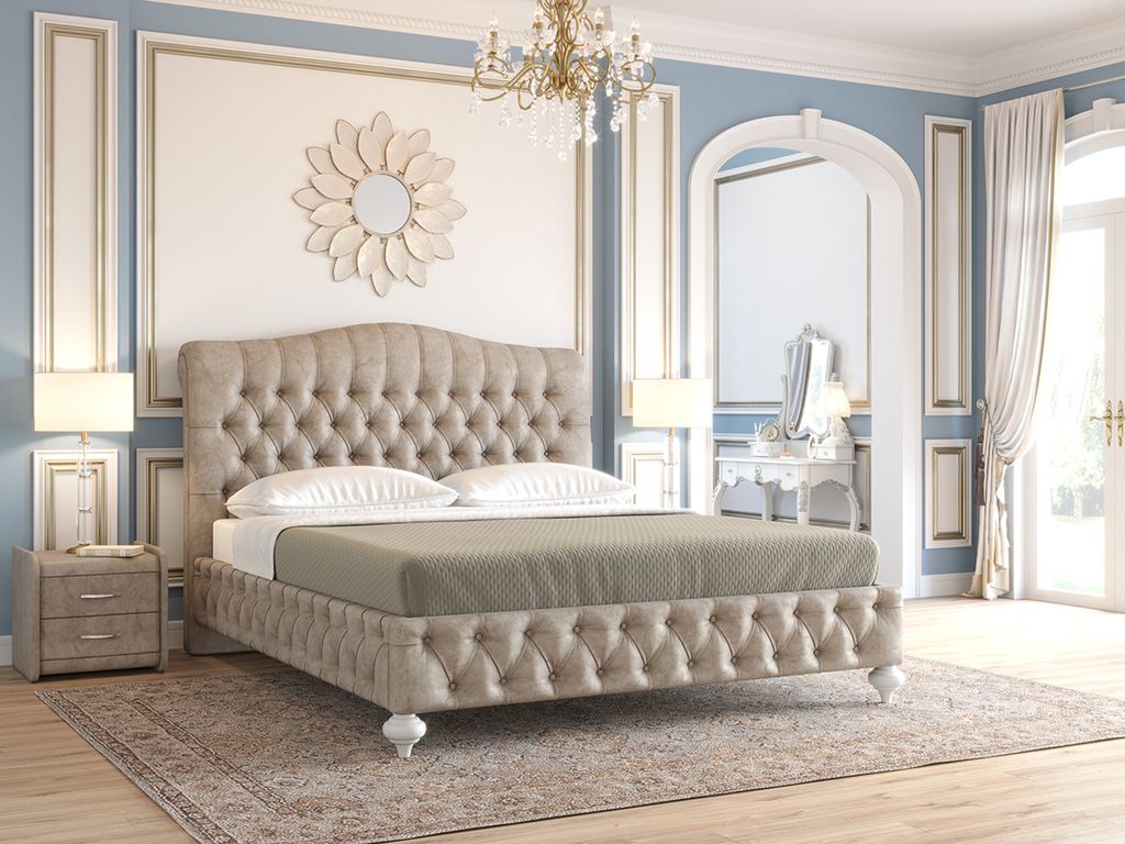 Изголовье кровати "Верона" выполнено в технике «каретная стяжка» и может быть декорировано пуговицами в тон основного материала, либо стразами.